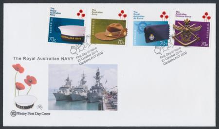 21-Oct-2014 Australian Defence Forces peel and stick Wesley First Day Cover with cachet of Naval Ships and Flanders Poppies, stamps depict Royal Australian Navy cap, Army Slouch hat, Royal Australian Air Force cap and Defence Force insignia tied Canberra pictorial postmark