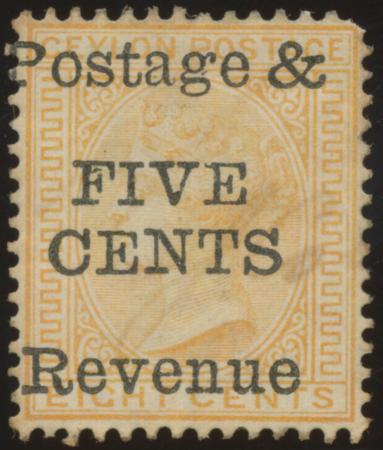 | 1885 Ceylon 5c on 8c Orange Yellow, surcharge 'Postage + Revenue', SG 179, MH short corner perf |