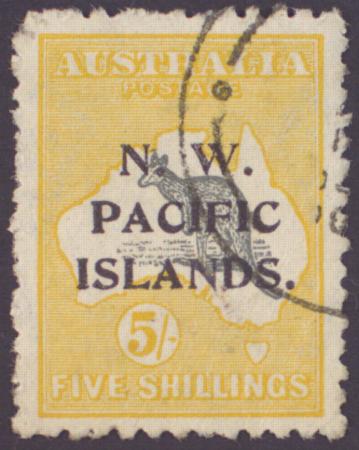 | 1916 NWPI 5/- Grey & Yellow Kangaroo KGV SG 92 type A Used Fluffy perfs |
