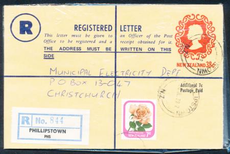 | QEII Registered Postal Stationery. 38c plus 7c. Samuel EF. 23a. Used.