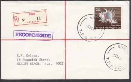 | "KIMBE/-3SE69/T.P. & N.G." (West New Britain Province)(Post Office Opening Day) and Registration label "R/KIMBE/NO. 11/T.P. & N.G." and violet hand stamp "RECOMMENDE" on 30c Murex Ramosus" on registered cover to Henley Beach S.A. with backstamps "KIMBE", "LAE REGISTERED", "REGISTERED ADELAIDE" and "HENLEY BEACH". Postmarker KZ-1 was in use from the opening of this office on 3 September 1969 to 30 June 1977