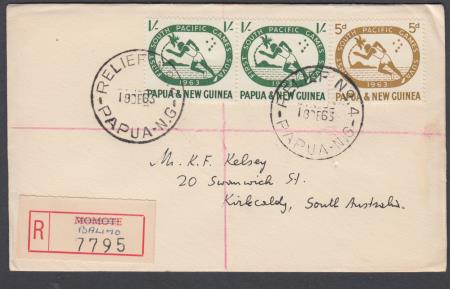 | "RELIEF NO. 4/18DE63/PAPUA-N.G" ((Western Province) and Registration label "R/MOMOTE (Struck Out) BALIMO (manuscript)/7795" on Pair 1/- and Single 5d First South Pacific Games on registered cover to Kirkcaldy S.A. with backstamps "RELIEF NO. 4", "PORT MORESBY", "MELBOURNE", "ADELAIDE" and "HENLEY BEACH". RELIEF CDS R-4 opened this office on 18 December 1963 and was in use until 21 April 1964. MOMOTE Registration Labels were overprinted (sic) (manuscript) BALIMO and used provisionally from 18 December 1963 to 26 February 1964.