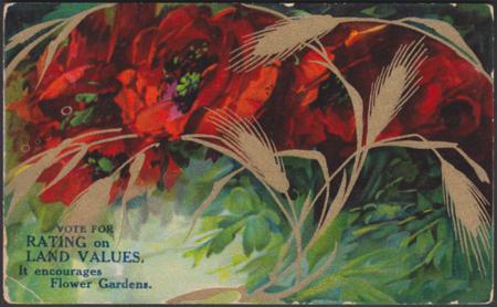 Vintage floral picture postcard printed with text urging the recipient to 'Vote for Rating on Land Values, it encourages Flower Gardens' at the Municipal Elections.