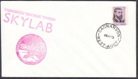| Australia 1973 (28 Jul) Space Cover "CARNARVON TRACKING STATION/SKYLAB" and red circular cachet "SPACEFLIGHT TRACKING & DATA NETWORK / SKYLAB/ IMAGE" unaddressed and affixed with 7c ochre Marcus Clark stamp cancelled "CARNARVON/28JY73/WEST-AUST"