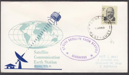 | Australia 1969 (19 Nov) Set of 3 Space Cover "IMAGE GLOBE/RADIO TELESCOPE/SPACE CRAFT" and "SATELLITE/COMMUNICATION/EARTH STATION/BLUE BAR (DELETING MOREE NSW)" and addressed to Oakwood Park or Adelaide or Goodwood S.A. with 5c G H Reid Stamp or Edmund Barton Stamp and Tab or Alfred Deakin Stamp cancelled "CARNARVON/19NO69/WEST-AUST" and purple oval handstamp "OTC (A) SATELLITE EARTH STATION/CARNARVON"