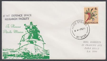 | Australia 1971 (01 Feb) Space Cover with green cachet "TO HONOUR/APOLLO MISSION/IMAGE OF SPACE MODULE ON MOON`S SURFACE" and black handstamp "JOINT DEFENCE SPACE/RESEARCH FACILITY" and addressed to Para Hills SA and affixed with 6c Kangaroo Paw stamp cancelled "ALICE SPRINGS/10 A - 1FE71/NT 5750" (Launch date of APOLLO 14 was 21:03:02 UTC 31st January (07:03:02 AEST 1st February 1971) Pine Gap is the commonly used name for a U.S. satellite surveillance base or Australian Earth station approximately 18 kilometres (11 mi) south-west of the town of Alice Springs, Northern Territory in the centre of Australia which is operated by both Australia and the United States. Since 1988, it has been officially called the Joint Defence Facility Pine Gap (JDFPG); previously, it was misleadingly known as Joint Defence Space Research Facility