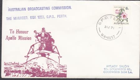 | Australia 1971 (31 Jul) Space Cover with purple/brown cachet "TO/HONOUR/APOLLO/MISSION/IMAGE SPACECRAFT LANDING MODULE ON MOON`S SURFACE" and blue handstamp "AUSTRALIAN BROADCASTING COMMISSION" and "THE MANAGER, BOX 1990, G.P.O. PERTH" addressed to Goodwood S.A. and affixed with 6c Sturt`s Desert Rose cancelled "G.P.O. PERTH/31JY71/WA-AUST"