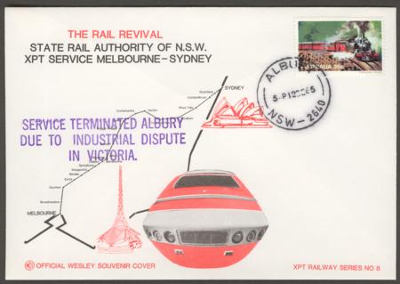 | 1985 Rail Revival Cover, Sydney Melbourne XPT Railway Series No8 Wesley Cover, Dec 11 1985. Handstamp "SERVICE TERMINATED ALBIRY/DUE TO INDUSTRIAL DISPUTE/ IN VICTORIA"