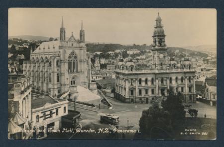 New Zealand Cathedral And Town Hall, Dunedin, Panorama 1 real photo No.201 Postcard