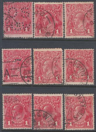 | 1d Red King George V Single Watermark (Type 2) Comb Perf 14.25 x 14 Smooth Paper Assorted Plates & Panes - Nine (9) Varieties - Used - 1-1-36 (O S NSW), 1-1-56, 1-2-28, 1-2-34 (T), 2-3-1?, 2-3-40, 2-3-60-II, 2-4-3-II, 2-4-36-II. BW 71 SG 21c.