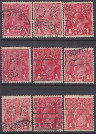 | 1d Red King George V Single Watermark (Type 2) Comb Perf 14.25 x 14 Smooth Paper Plate 3 - Nine (9) Pane 5 Varieties - Used - 3-5-50, 3-5-51 (OS/NSW), 3-5-53-II, 3-5-54 (NC), 3-5-55?, 3-5-56, 3-5-57 (OS/NSW), 3-5-59, 3-5-1. BW 71 SG 21c. Format is "plate-pane-position-state".