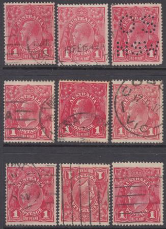 | 1d Red King George V Single Watermark (Type 2) Comb Perf 14.25 x 14 Smooth Paper Plate 3 - Nine (9) Pane 5 Varieties - Used - 3-5-55?, 3-5-56, 3-5-57 (O S NSW), 3-5-59, 3-5-1, 3-5-6, 3-5-7, 3-5-9, 3-5-10. BW 71 SG 21c.