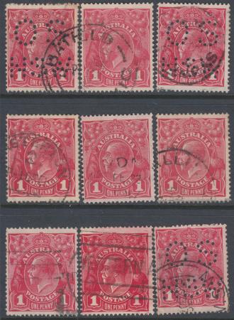 | 1d Red King George V Single Watermark (Type 2) Comb Perf 14.25 x 14 Smooth Paper Plate 3 - Nine (9) Pane 5 Varieties - Used - 3-5-38 (OS/NSW), 3-5-41-II, 3-5-48 (OS/NSW), 3-5-49-I, 3-5-50, 3-5-51, 3-5-53, 3-5-54, 3-5-56 (OS/NSW). BW 71 SG 21c. Format is "plate-pane-position-state".