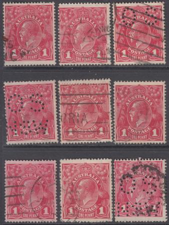 | 1d Red King George V Single Watermark (Type 2) Comb Perf 14.25 x 14 Smooth Paper Plate 3 - Nine (9) Pane 5 Varieties - Used - 3-5-1, 3-5-6, 3-5-7 (OS), 3-5-10 (OS/NSW), 3-5-12-III, 3-5-15-II, 3-5-21-I, 3-5-24, 3-5-25 (OS/NSW). BW 71 SG 21c. Format is "plate-pane-position-state".