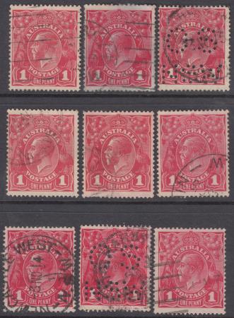| 1d Red King George V Single Watermark (Type 2) Comb Perf 14.25 x 14 Smooth Paper Plate 3 - Nine (9) Pane 5 Varieties - Used - 3-5-21, 3-5-24, 3-5-25 (OS/NSW), 3-5-26, 3-5-37, 3-5-38, 3-5-48, 3-5-49 (OS/NSW), 3-5-50. BW 71 SG 21c. Format is "plate-pane-position-state".