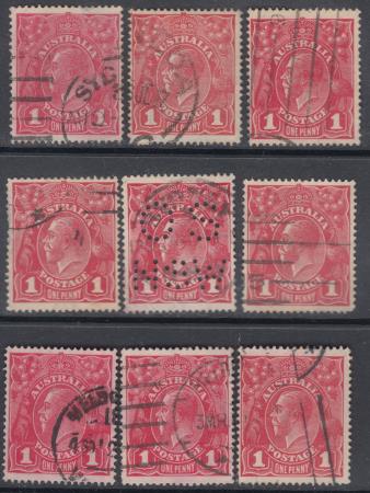 | 1d Red King George V Single Watermark (Type 2) Comb Perf 14.25 x 14 Smooth Paper Plate 3 - Nine (9) Pane 5 Varieties - Used - 3-5-59, 3-5-1-II, 3-5-7-II, 3-5-40-II, 3-5-12 (OS/NSW), 3-5-15, 3-5-25-III, 3-5-26, 3-5-37-II. BW 71 SG 21c. Format is "plate-pane-position-state".