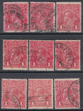 | 1d Red King George V Single Watermark (Type 2) Comb Perf 14.25 x 14 Smooth Paper Plate 3 - Nine (9) Pane 5 Varieties - Used - 3-5-12, 3-5-15, 3-5-25-III, 3-5-26-II, 3-5-37-II, 3-5-38-II, 3-5-48-II, 3-5-49, 3-5-50. BW 71 SG 21c.