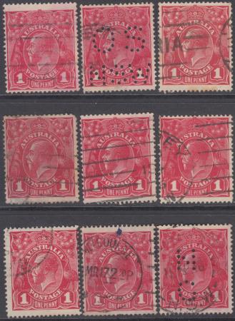 | 1d Red King George V Single Watermark (Type 2) Comb Perf 14.25 x 14 Smooth Paper Plate 4 - Nine (9) Pane 7 Varieties - Used - 4-7-7, 4-7-13 (OS/NSW), 4-7-14-I, 4-7-15, 4-7-18, 4-7-19-I, 4-7-30, 4-7-36, 4-7-38 (N C). BW 71 SG 21c. Format is "plate-pane-position-state".