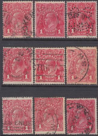 | 1d Red King George V Single Watermark (Type 2) Comb Perf 14.25 x 14 Smooth Paper Plate 4 - Nine (9) Pane 7 Varieties - Used - 4-7-7, 4-7-15, 4-7-18 (OS/NSW), 4-7-40, 4-7-43, 4-7-52, 4-7-55, 4-7-1, 4-7-3. BW 71 SG 21c. Format is "plate-pane-position-state".