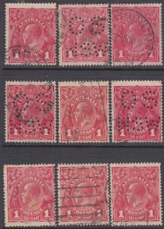 | 1d Red King George V Single Watermark (Type 2) Comb Perf 14.25 x 14 Smooth Paper Plate 4 - Nine (9) Pane 8 Varieties - Used - 4-8-30, 4-8-42 (OS/NSW), 4-8-49, 4-8-51 (OS/NSW), 4-8-52, 4-8-54 (OS/NSW), 4-8-55, 4-8-2, 4-8-6. BW 71 SG 21c. Format is "plate-pane-position-state".
