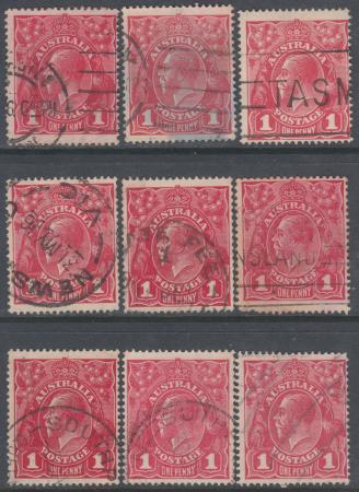 | 1d Red King George V Single Watermark (Type 2) Comb Perf 14.25 x 14 Smooth Paper Plate 4 - Nine (9) Pane 8 Varieties - Used - 4-8-42, 4-8-49, 4-8-52, 4-8-54, 4-8-9, 4-8-9-II, 4-8-10, 4-8-14, 4-8-30. BW 71 SG 21c.