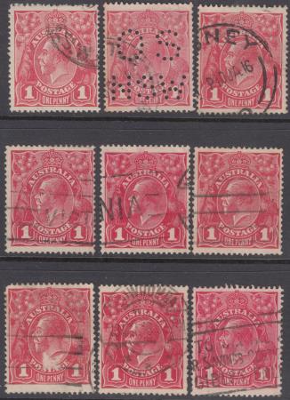 | 1d Red King George V Single Watermark (Type 2) Comb Perf 14.25 x 14 Smooth Paper Plate 4 - Nine (9) Pane 8 Varieties - Used - 4-8-30, 4-8-42 (OS/NSW), 4-8-49, 4-8-49-II, 4-8-52, 4-8-52-II, 4-8-54, 4-8-9, 4-8-9-III. BW 71 SG 21c. Format is "plate-pane-position-state".