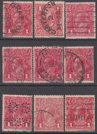 | 1d Red King George V Single Watermark (Type 2) Comb Perf 14.25 x 14 Smooth Paper Plate 4 - Nine (9) Pane 8 Varieties - Used - 4-8-54, 4-8-9 (INVERTED WMK), 4-8-10, 4-8-14, 4-8-30, 4-8-42, 4-8-49 (OS/NSW), 4-8-49-II, 4-8-52. BW 71 SG 21c. Format is "plate-pane-position-state".