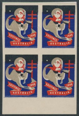 | 1949 Imperf block of 4 Greetings Australia, Santa on Kangaroo Anti TB Christmas seal |