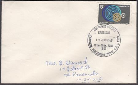 | 19-20 June 1969: Five Power Meeting, Canberra Parliament House (U.K., Australia, NA, Singapore, Malaysia) APM2760 on plain addressed cover affixed with grey, blue, purple, gold 5c ILO stamp cancelled "19 JUN 1969" FDU.