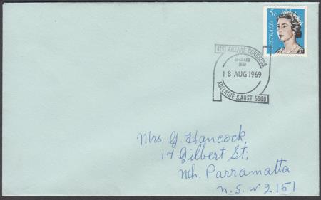 | 18-22 August 1969: 41st ANZAAS Congress, Adelaide SA APM 2820 (Australia New Zealand Congress for the Advancement of Science) on plain addressed cover affixed with blue and black QEII Coil stamp cancelled "18 AUG 1969" FDU