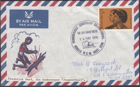| 16 May 1970: Thunderbolt Centenary Celebrations, Uralla NSW APM4010 on pictorial air mail cover of aborigine starting fire and affixed with brown and black 5c Royal Visit 1970 stamp cancelled "16 MAY 1970/URALLA NSW" FDU