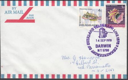 | 14-19 September 1970: Commencement of Overland Telegraph Line 1870, Darwin NT APM4100 on addressed air mail cover affixed with seashell stamps from Cocos (Keeling) Islands 1c and 4c and cancelled "14 SEP 1970/DARWIN" FDU