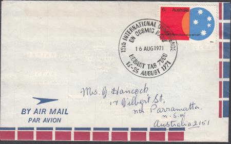 | 16-25 August 1971: 12th International Conference on Cosmic Rays, Hobart APM4400 on addressed air mail cover affixed with 6c red, orange and blue ANA stamp cancelled "16 AUG 1971" FDU