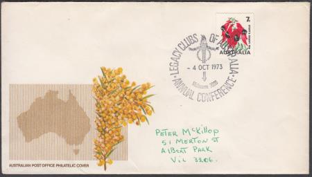 | 4-6 October 1973: Annual Conference of the Legacy Clubs of Australia APM5080 on addressed Australian Post Office Philatelic Cover Map and Wattle and affixed with 7c red, black and green Sturts Desert Pea stamp cancelled "-4 OCT 1973" FDU