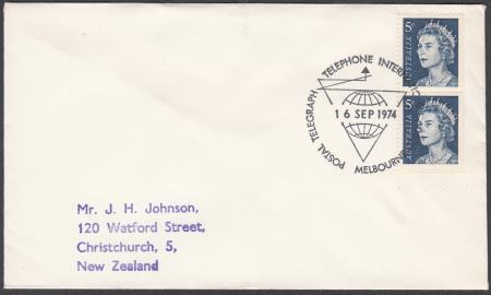 | 16-20 September 1974: 6th Postal, Telegraph and Telephone International Asian Regional Conference Melbourne APM5380 on plain addressed cover affixed with pair blue 5c QEII stamps cancelled "16 SEP 1974" FDU