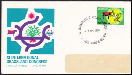 | 10 April 1970 11th International Grasslands Conference Surfers'Paradise, (APM 3060), 13 April on First Day of Issue cover featuring Conference logo.