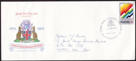 | 5 May 1971 Centenary of Sydney Stock Exchange, (APM 4290), on embossed commemorative cover with single stamp.