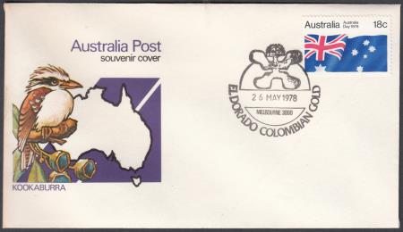 | 26 May- 2 July 1978: El Dorado Colombian Gold Exhibition, Melbourne APM6580 on unaddressed APO Souvenir Cover Kookaburra and Map and affixed with 18c Australia Day 1978 stamp cancelled "26 MAY 1978" FDU