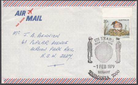 | 1-28 February 1979: 175th Anniversary of Tasmanian Police Force Hobart APM7140 on addressed Air Mail cover affixed with 20c Grebe stamp cancelled "-1 FEB 1979" FDU