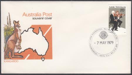 | 5-10 May 1979: 27th Lions International Convention, Perth APM7340 on unaddressed AP Souvenir Cover Kangaroos and Map and affixed with 20c Performing Arts stamp cancelled "-7 MAY 1979"
