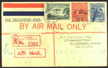 | 2 June 1929, Perth W.A. to Melbourne via first Perth-Adelaide flight. (AAMC 137). Postmarked Perth 4 June 1929, backmarked Registered Perth - Melbourne - Caulfield - Carnegie - Glenhuntly.