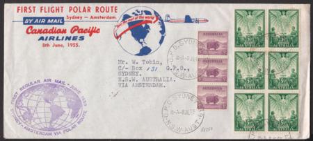 | 8 Jun 1955, Sydney - Amsterdam Polar Route flight, (AAMC 1351). Cachet on cover, postmarked Sydney 8JE55, backmarked Amsterdam Centr Station 11 VI 1955 and Sydney 16JE55