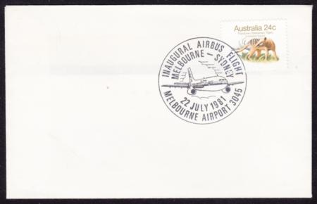 | 22 July 1981, Inaugural flight from Melbourne to Sydney by TAA Airbus A300 VH-TAA, (AAMC 1918), commemorative cancel no backstamp.