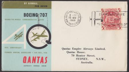 | 16 Nov 1960, Qantas 40th Anniv flight round the world. (AAMC 1443) Postmarked 16 NOV 1960, backmarked 23NOV 1960, cachet on back.