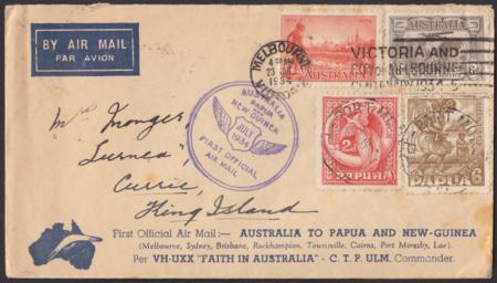 | 24 Jul 1934, Australia - New Guinea - Australia, (AAMC 393). Postmarked Melbourne 23JUL1934 & Port Moresby 26JY34, backmarked with violet cachet, Port Moresby 26JY34 & Melbourne 1AU324