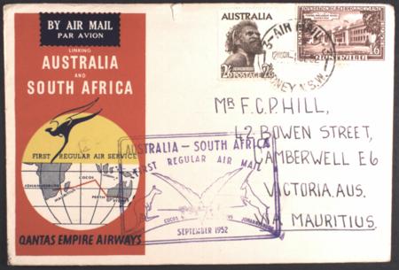 | 1 Sept 1952, Mauritius boomerang cover via first Qantas Australia - South Africa flight (AAMC 1308a). |