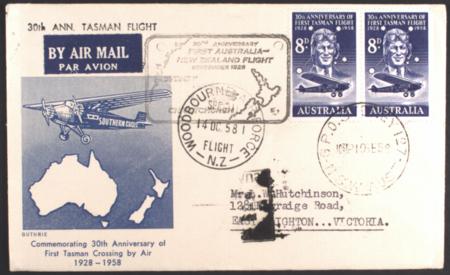 | 11 Sep 1958, TEAL 30th Anniv of Kingsford Smith's trans Tasman flight, (AAMC 1395a).cachet on cover, postmarked Sydney 10SE58 and Woodbourne 14 OC 58, Christchurch 11SP58 and Sydney 14OCT1958