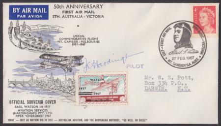 | 27 Feb 1967, 50th Anniv. of 1917 Mt Gambier-Melbourne air mail flight, (AAMC 1593), vignette on cover with special postmarker, backmarked Melbourne 27FE67, signed by pilot