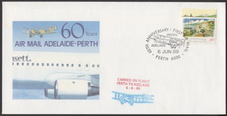 | 2 June 1989, 60th Anniv. of first flight Perth to Adelaide, (AAMC 2074), pictorial postmark Perth 6JUN89 and cachet, backmarked Adelaide 6JUN1989
