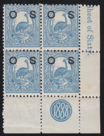 | 1888 2d Prussian Blue OS block of 4, perf 11 x 12, SG O40, with monogram at base |